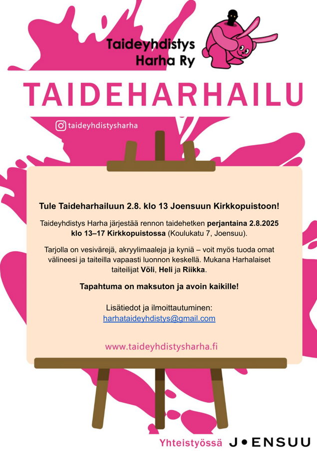 Taideyhdistys Harha on matalan kynnyksen taideyhteisö, jossa ammattilaiset ja harrastajat toimivat yhdessä. Toimintamme perustuu vapaaehtoisuuteen ja sijoittuu Joensuuhun. Harha on monitaiteellinen yhdistys, jonka painopiste on kuvataiteessa. Yhteisöllisyys, avoimuus ja tekemisen ilo ovat toimintamme ytimessä. Tavoitteenamme on tarjota tila, jossa taide tulee näkyväksi sekä tarjota yhteisöllisyyttä, joka tukee taideharrastusta tai ammattilaisen taiteellista työskentelyä. Harhaan ovat tervetulleita kaikki taiteesta innostuneet, olitpa vasta aloittamassa tai jo kokenut tekijä.